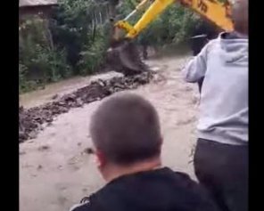 Село расположено в долине ручья Домашин, что впадает в реку Уж. После сильных ливней вода поднялась. Люди пытаются углубить придорожную канаву. Это не помогает.