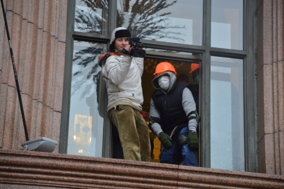 На то время, в помещении находилось до двух сотен митингующих. Они спешно начали возводить баррикады внутри и через окно второго этажа призывали людей им помочь.
