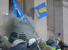 Кто-то бросает в милиционеров дымовую шашку. Поднимается черный дым, правоохранители натягивают противогазы.