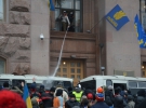 После того, как бойцы внутренних войск покинули последнюю баррикаду евромайдана на улице Михайловской, около 50 бойцов спецподразделения "Беркут" заблокировали центральный вход в Киевскую городскую администрацию, где располагается революционный штаб. В 8:30 три автобусы подъехали вплотную к двери, и перекрыли вход и выход из здания. Из них высыпались бойцы и окружили автобусы, начали готовиться к штурму.