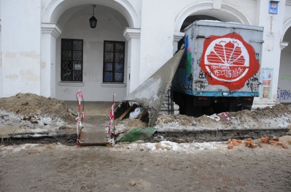 Несмотря на то, что Министерство культуры предоставило Гостиному двору статус памятника градостроительства Киева и внесло его в государственный реестр, здесь сегодня снова начались ремонтные работы. Причем на территорию двора пригнали тяжелую технику.