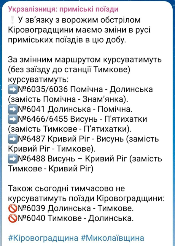 На фоне атаки на Кировоградскую область изменено движение ряда поездов, пишет Укрзализныця.