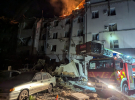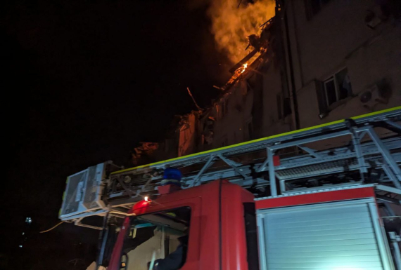 ГСЧС сообщает, что российская ракета попала в пятиэтажную гостиницу - там вспыхнул пожар. Разрушена лестничная клетка, под завалами могут находиться люди.
