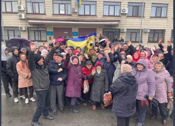 "Считаю, что это фото дня. Освобожден Иванков в Киевской области. Там россияне устраивали показуху с раздачей гуманитарки и съемкой пропагандистских сюжетов. Но люди с украинскими флагами радуются после освобождения города украинской армией", - сообщил он.