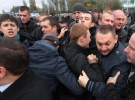 Другая девушка начала разбрасывать листовки против депутата-"регионала" Игоря Лысова. Один из парней-"спортсменов" заломил ей руки и быстро собрал разбросанные листовки.
