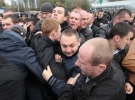 Через несколько минут возле протестующих появилось 10 молодых людей спортивного телосложения. Они начали отбирать у людей транспаранты и рвать их, бросать на землю.