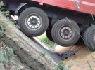 Прицеп застрял между частями переправы. Зерном усеяло дорогу. Водитель не пострадал, потому что мост не слишком высокий, говорилось в ТСН.