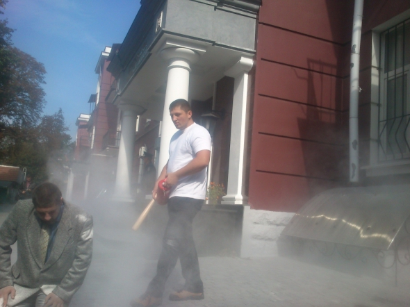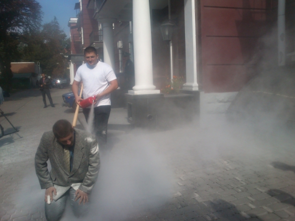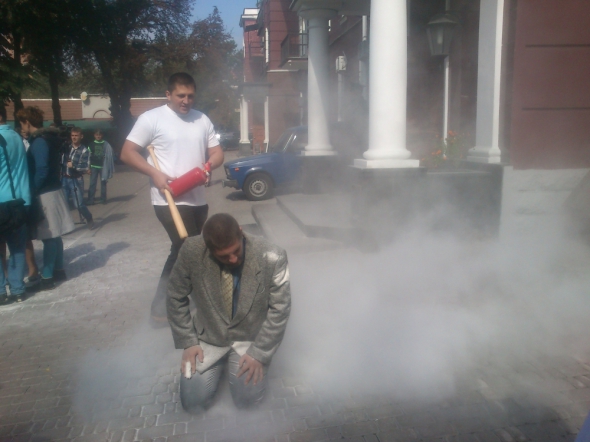Перед входом в прокуратуру ребята пшикалы друг в друга с огнетушителей, имитировали драку. На это собралось посмотреть половина прокуратуры.