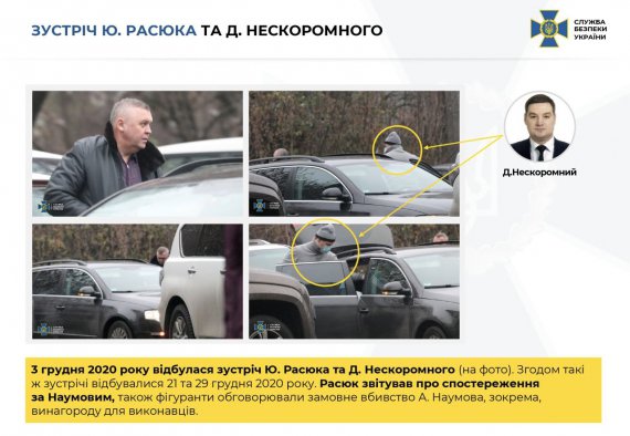 Нескоромный совместно с сотрудником Антитеррористического центра при СБУ Юрием Расюком решили убить Наумова, по данным следствия. Среди доказательств, подтверждающих это, - видео- и фотоматериалы, аудиозаписи разговоров Расюка, Нескоромного и других лиц, во время которых, в частности, обсуждается организация убийства, исполнители и другие детали.