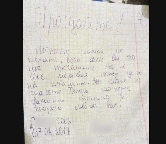 "Впоследствии школьницу, которая сбежала разыскали. Она рассказала, где находится ее подруга. На поиски ребенка бросились все патрули, спецподразделение и военные. За несколько часов девочку нашли. Она стояла на последнем, 16 этаже многоэтажки. У ребенка были порезаны руки. Рядом лежали наушники и еще одна записка. Там она написала последнее желание. Школьница была беспомощна и не могла объяснить, для чего это делает. Пострадавшей сразу вызвали "скорую". У нее были как новые, так и старые порезы (надписи, рисунки) на руках и ногах. Врачи оказали необходимую помощь. Порезы неглубокие и жизни не угрожают".