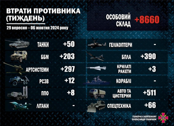 "С 29 сентября по 6 октября потери противника составили около 8660 человек личного состава. Кроме этого, украинскими защитниками уничтожено по меньшей мере три вражеских ракеты и 390 беспилотников", - говорится в сообщении.