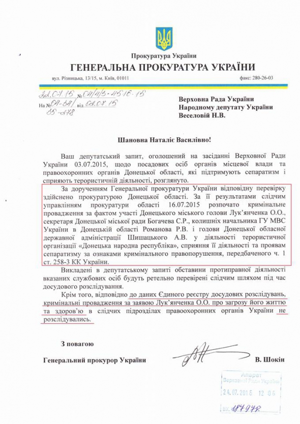 "Следственным управлением 16 июля 2015 года начато криминальное производство по фактам участия Донецкого городского головы Александра Лукьянченко, секретаря Донецкого городского совета Сергей Богачева, бывшего начальника Главного управления Министерства внутренних дел Украины в Донецкой области Романа Романова, главы Донецкой областной государственной администрации Андрея Шишацкого в деятельности террористической организации "Донецкая народная республика", содействия ее деятельности и проявлениям сепаратизма", - говорится в ответе на запрос.