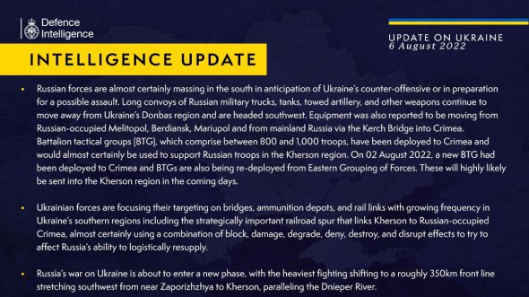 Согласно данным британской разведки на 4 августа, армия России пытается нанести удар по оборонным подразделениям Украины на трех направлениях – в Харьковской, Луганской и Донецкой областях. В то время как Вооруженные силы Украины контратакуют на Изюмском направлении.