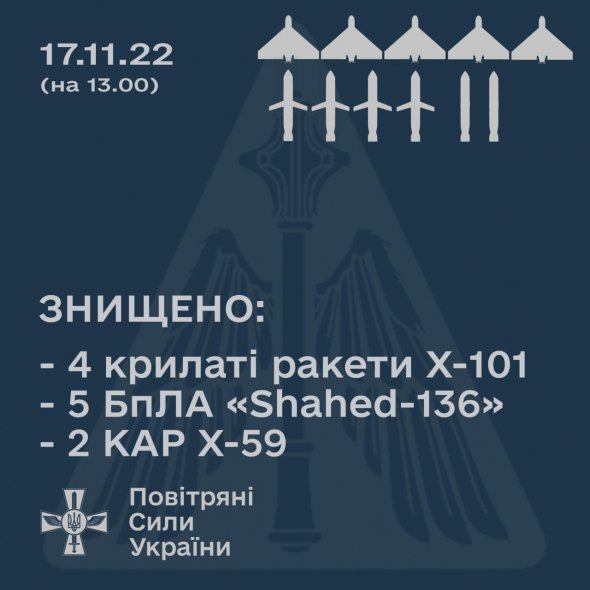 Враг продолжает атаки по Украине, 17 ноября было выпущено 18 крылатых ракет.