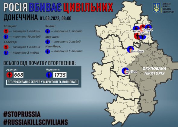 В частности, за 31 июля враг убил трех мирных жителей Донбасса: двоих в Бахмуте и еще одного в Соледаре. Об этом сообщил глава областной военной администрации Павел Кириленко 1 августа в Telegram.