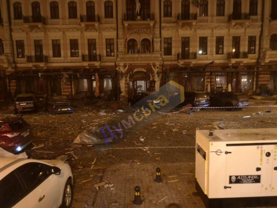 Зафиксированы мощные взрывы, на месте обстрела образовалась большая воронка. От взрыва пострадала гостиница "Бристоль" рядом с Одесской филармонией.
