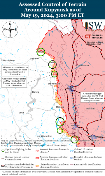 19 мая российские войска продолжали наступление на линии Купянск-Сватово-Кременная, однако подтвержденных изменений линии фронта не было. Россияне также продолжали наступать к северо-востоку от Купянска в районе Синьковки и к северо-западу от Сватового возле Ивановки, Берестового, Кисловки, Степной Новоселовки, Стельмаховки.
