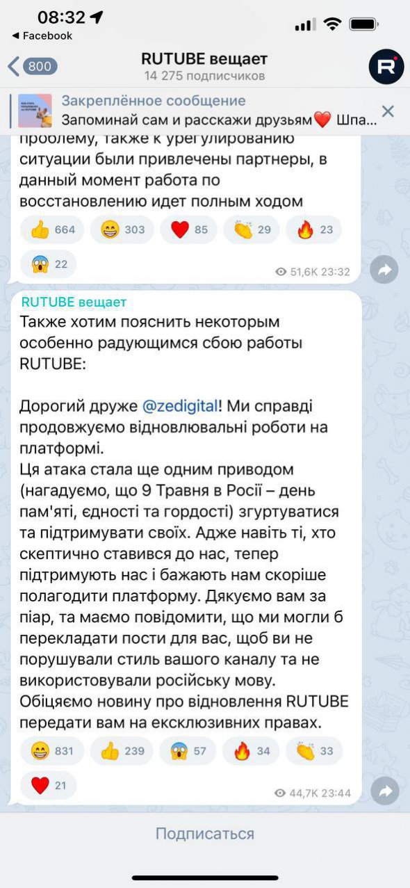 "Неработающий вторые сутки Rutube заговорил на украинском. Будем работать дальше, пока Кремль не заговорит", - написал он.
