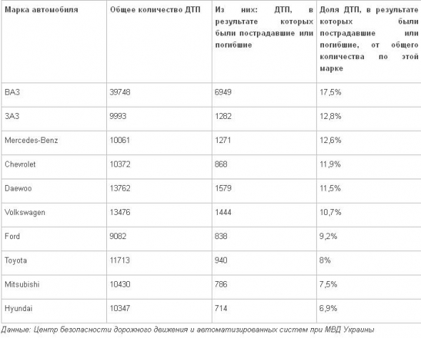 На сегодняшний день в Украине чаще всего попадают в ДТП автомобили ВАЗ. За 11 месяцев 2012 года аварий с их участием зарегистрировано 39 тыс. 748 шт, сообщили в Центре безопасности дорожного движения и автоматизированных систем при МВД Украины.