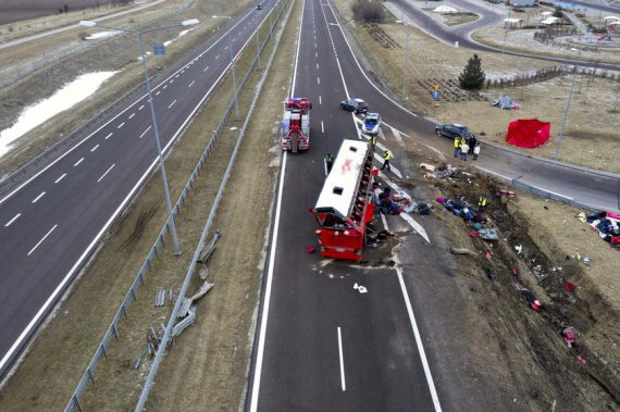 Авария произошла около 23.50 5 марта у города Ярослав в Польше. Водитель автобуса Познань-Херсон не справился с управлением, пробил ограждение, слетел с эстакады на обочину и перевернулся. В салоне находилось 57 граждан Украины, среди которых двое - водители. Погибли 5 человек. 41 получили травмы, пятеро из них в критическом состоянии. На вызов об аварии выезжали около 100 спасателей, пожарных, полицейских, медиков. Пострадавших транспортировали в том числе и двумя вертолетами, в 6 больниц.
