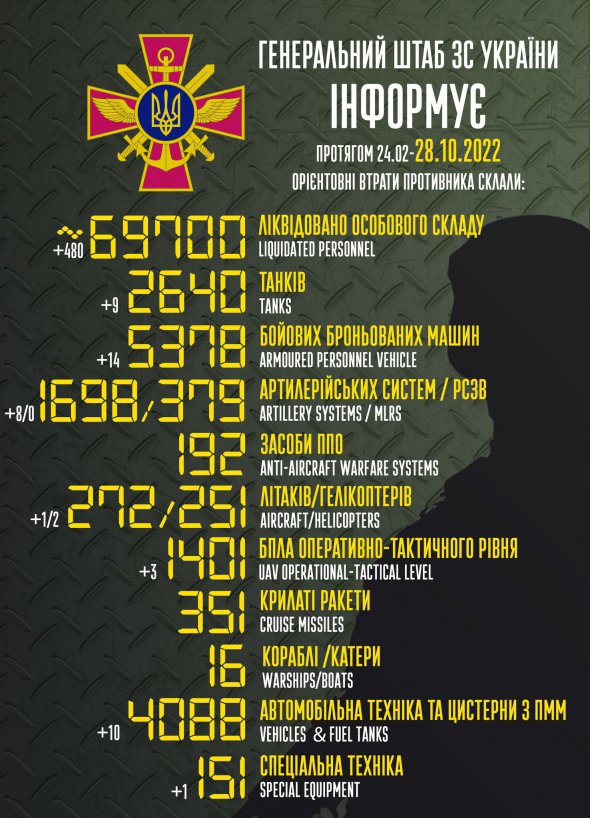 Общие боевые потери России к утру 28 октября составляют более 69 700 человек.