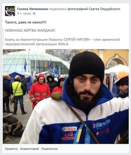 Заместитель председателя Радомышльского райсовета, что на Житомирщине, Галина Литвиненко через несколько дней после похорон застреленного на улице Грушевского активиста Сергея Нигояна высказалась о нем так: "Такого и не жаль".