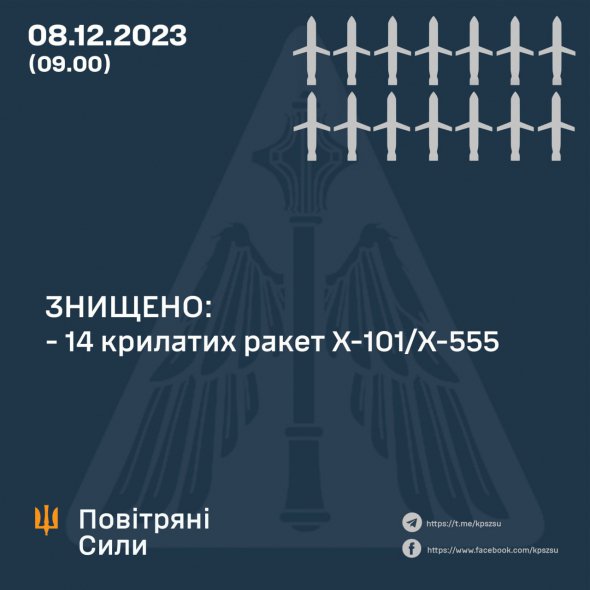 "По состоянию на 09:00 уничтожены 14 из 19 крылатых ракет Х-101/Х-555 в Днепропетровской и Киевской областях.