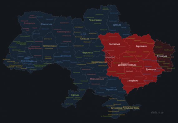 В Днепропетровской, а также в Полтавской, Харьковской, Запорожской, Донецкой и Луганской областях продолжается воздушная тревога. Жителей этих регионов просят оставаться в укрытиях.