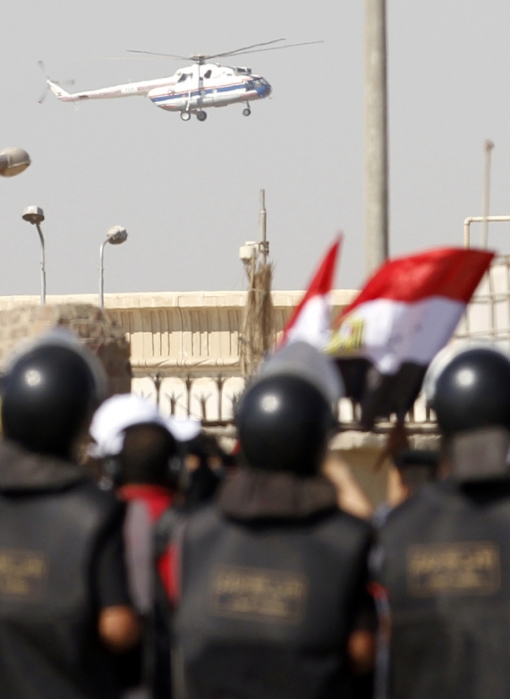 Через некоторое время на реанимационном вертолете канцелярии президента АРЕ Мубарака доставили в Полицейскую академию в новой части Каира, носившую ранее его имя, в 20 км от египетской столицы, где в специально оборудованном зале начался судебный процесс. В здание Мубарака завезли на специальной медицинской кровати с колесиками.