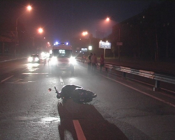 Между станциями метро "Нивки" и "Шулявская" мопед, который ехал в четвертой полосе движения, неожиданно потерял управление и врезался в разделительный металлический отбойник.