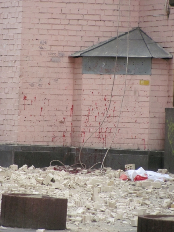"Я стоял на балконе. Видел, как от стены отпала глыба. Дырка осталась размером с метр. Она зацепила троллейбусные провода, поднялся столб дыма. Минут 10 ничего не было видно, - говорит 25-летний Сергей, который делает ремонт в доме напротив. - Когда пиль осела, все увидели, что кирпичом прибило человека. Он был в джинсах, спортивной куртке, рядом лежала сумка с бумагами".