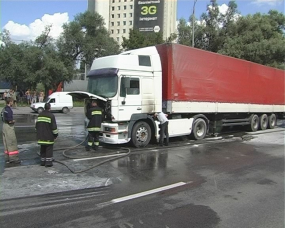 На месте происшествия работали спасатели. Открытое пламя удалось сбить. Свидетели рассказали, что грузовик двигался в сторону Одесского моста. Проехала мимо стоянки, где стояли фуры и вдруг водители увидели, что из машины валит пламя. Мужчины по рации передали об опасности. Никто из людей не пострадал.