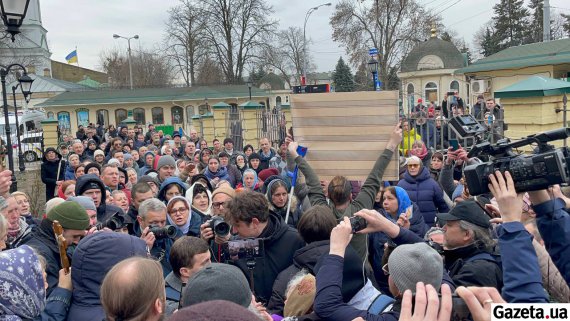 Тем временем людей у Киево-Печерской лавры становится все больше. Многие киевляне приходят, чтобы поддержать выселение из заповедника российской церкви.