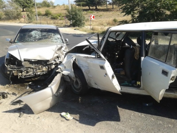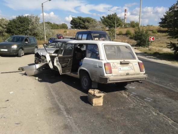 В районе Камышовой объездной в Крыму произошло ДТП. По предварительным данным, виновником аварии стал водитель "четверки", который при обгоне боком задел "копейку", после чего произошло лобовое столкновение с "Chery".