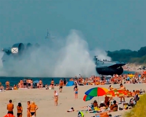 Как рассказали очевидцы, "Зубр" поднял огромные волны. Отдыхающие не на шутку перепугались. Затем из корабля выбежали морские пехотинцы, выставили оцепление и попытались отогнать зевак от секретного объекта. Люди, убедившись, что никто не стреляет и все спокойно, продолжили греться на солнце.