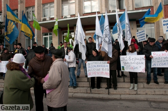 Митингующие собираются утром возле здания городского совета. За час сходится около 200 человек. Большинство из повязками "Долой произвол". В руках держат плакаты с надписями "Верните детям кислород", "Не руби тополь, не ломай калину", "Верните парк городу". Люди планируют принять участие в заседании сессии, которая должна начаться в 10.00. В это время у входа в городской совет собираются ребята с флагами Партии регионов.