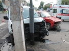 "А "Рено" двигался во встречном направлении. После столкновения их отбросило на тротуар. "Рено" врезался в железный столб, на котором висит светофор. Кто виноват в аварии, выяснит следствие. Оба водителя отделались испугом, а пассажирка ВАЗа получила многочисленные повреждения. Ее госпитализировали в больницу", - рассказал он.