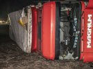 Грузовик перевернулся на бок. Водитель не пострадал.