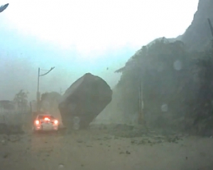 Перед его автомобилем на проезжую часть дороги упал гигантский камень. Падение вызвал оползень, возникший из-за непрекращающихся на острове дождей.