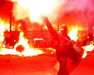 Возле стадиона "Динамо" митингующие жгут спецтехнику и автобусы, которые мешают проходу по ул. Грушевского. Горят автобусы "Богдан" и военные авто ЗИЛ, передает Цензор.НЕТ.