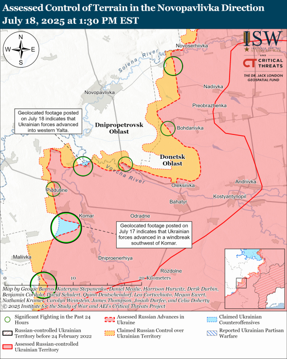 В то же время некоторые российские источники утверждают, что войска РФ продвинулись на один километр к юго-западу от Поддубного на участке фронта шириной два километра. Однако ISW не имеет подтверждений этим заявлениям.