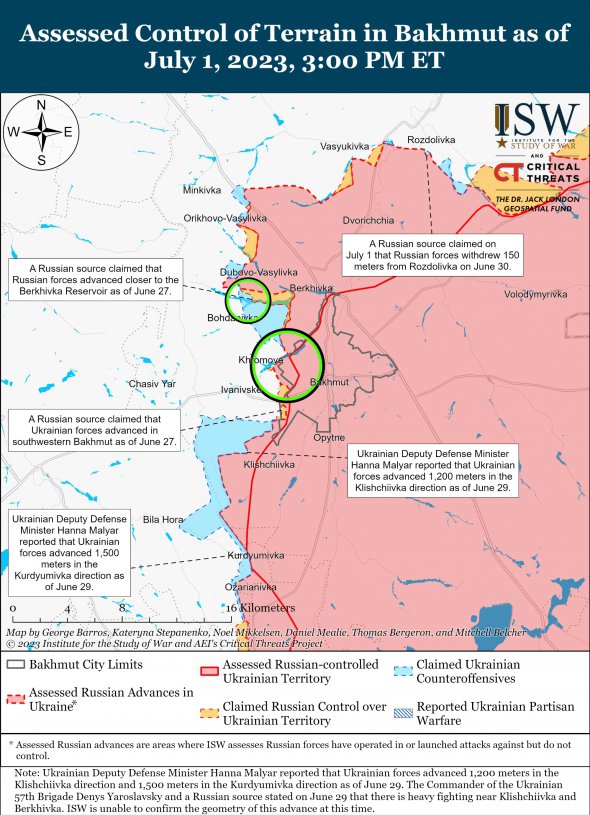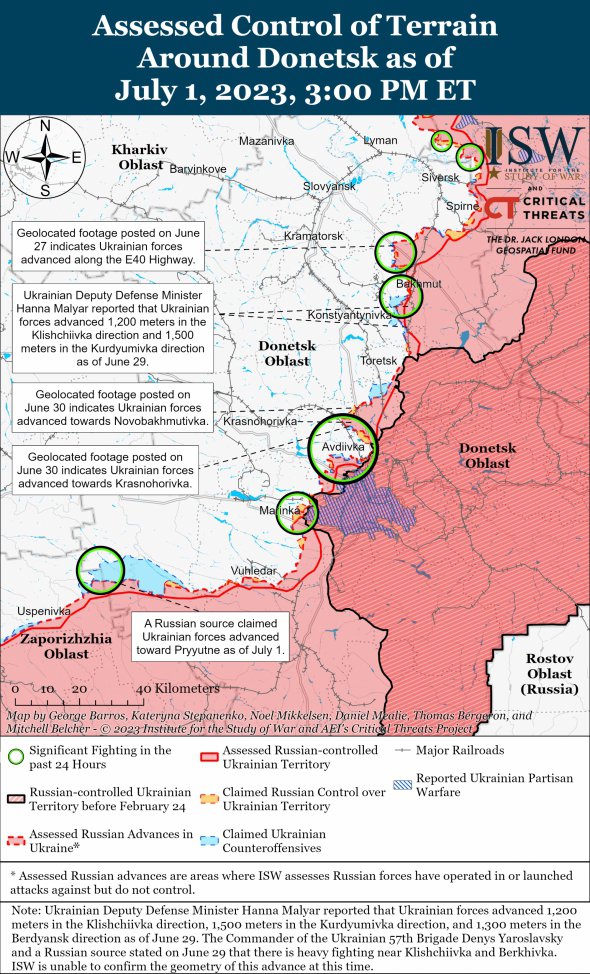 Украинские войска 1 июля продолжали наземные атаки возле Бахмута. Российские "военкоры" утверждали, что украинские войска продвигались с Приволья вдоль трассы E40 и вблизи Клищиевки.