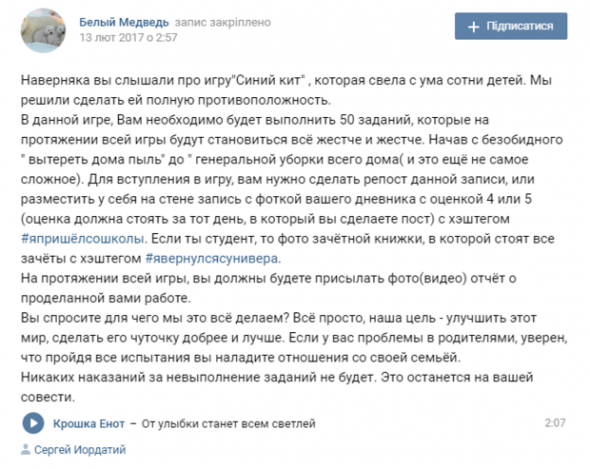 Двое студентов-второкурсников из Приднестровья запустили в интернет игру под названием "Белый медведь". Она является полной противоположностью смертельной игры "Синий кит". Разработчики проекта - Сергей Иордатий и Павел Доника. Их идею поддержали правоохранители и студенческий профсоюз. Поэтому ребята создали сообщество в соцсети "ВКонтакте".
