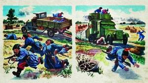 Броньовик із червоною зіркою розстрілює полохливих козаків-"петлюрівців" у жупанах і шароварах - ілюстрація до оповідання Петра Панча "Син Таращанського полку", яке вивчали в четвертому класі. Підручник з української літератури, 1984 рік