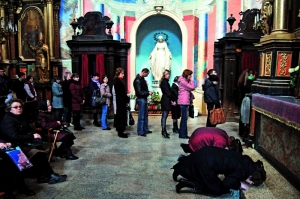 Перед Великоднем у Львівських церквах люди стоять у чергах до сповіді. Деякі тягнуться з храму аж на подвір'я. Дехто займає чергу й іде чекати надвір на лаву