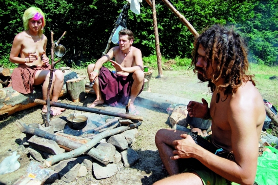 Посеред галявини на зрубаному стовбурі висить прапор анархії. Навколо сім наметів панків. З одного вилазить хлопець із синім ірокезом – Гобіт, 21 рік. Починає шукати в пакетах їжу.