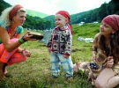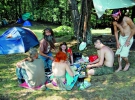 На початку поляни намети "олдів" – тих, хто був одними з перших хіпі в Україні. Восьмеро чоловіків у затінку розкладають консерви й тушонку. Нарізають ковбасу, помідори, огірки, цибулю. По колу передають великий металевий кухоль із вином.