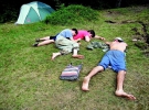 Біля зеленого намету лежать дві дівчини. Засмагають голяка. Голови накрили футболками.