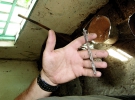 Пролазить через паркан із розбитими штахетинами. На дверях обмащеної глиною хати висить велика колодка. Із рукомийника біля входу капає вода. Антон відкриває кришку.