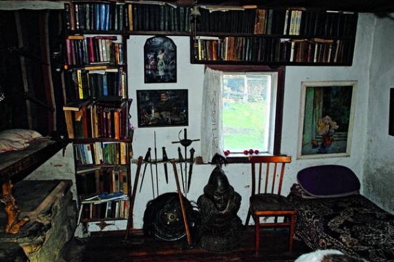 Половину кімнати займає кам'яна піч, біля неї стоять три сокири.